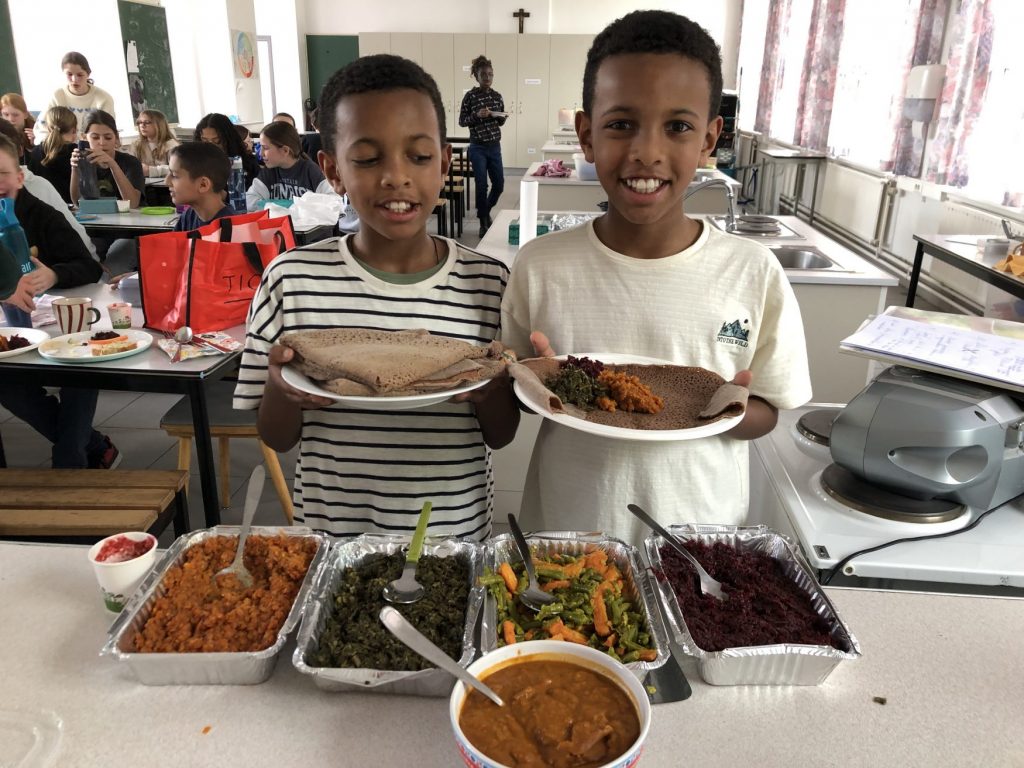 We kregen een volledige Ethiopische vegetarische maaltijd voorgeschoteld ! Plantaardige proevertjes van de bovenste plank !