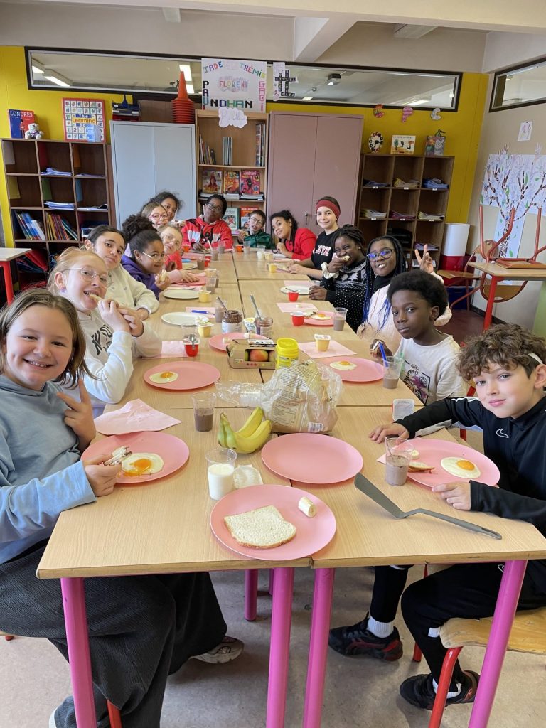 Nous avons relevé ce défi avec beaucoup de joie. Nous avons manger des yaourts, des fruits (pommes et bananes), des œufs sur le plat réalisé par la super cheffe madame Emi! Nous avons aussi eu de verres de lait, du pain avec de la confiture à la fraise et de la pâte à tartiner pour les plus difficiles. Nous nous sommes régalés 😍