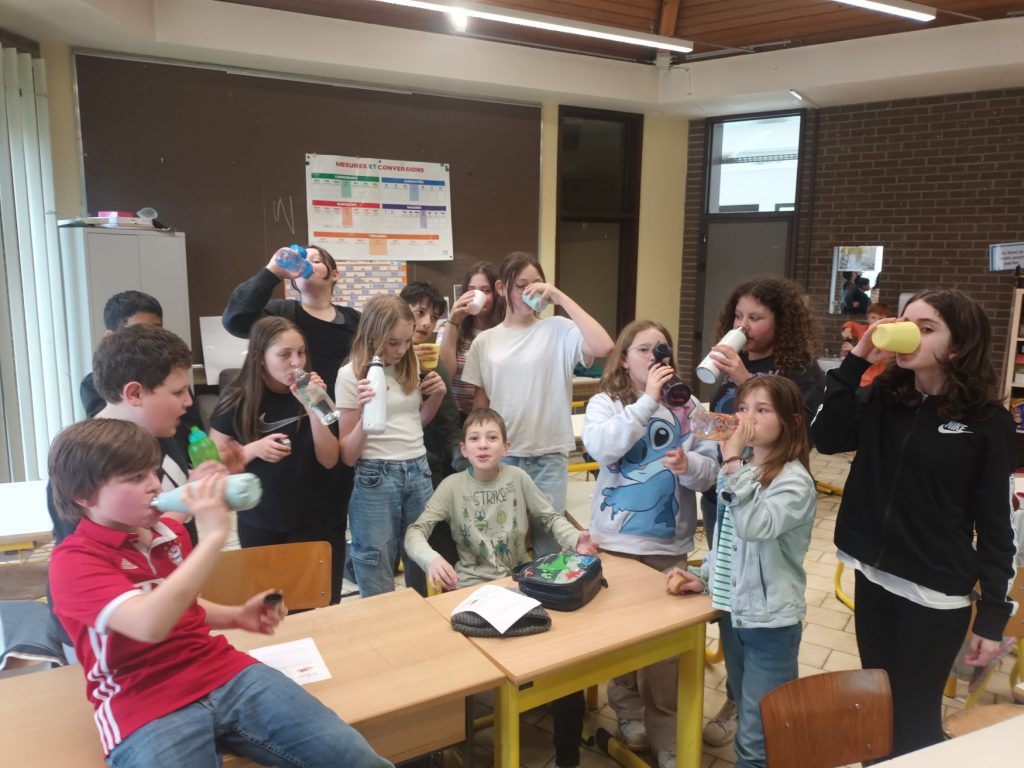 Comme tous les jours, nous buvons de l'eau en classe. Celui du milieu venais juste de se renverser sa gourde sur lui.