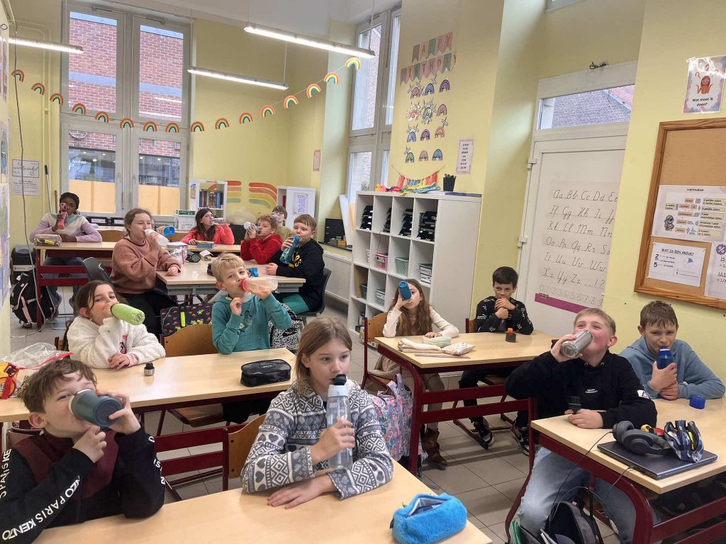 Water drinken uit onze herbruikbare drinkbussen.