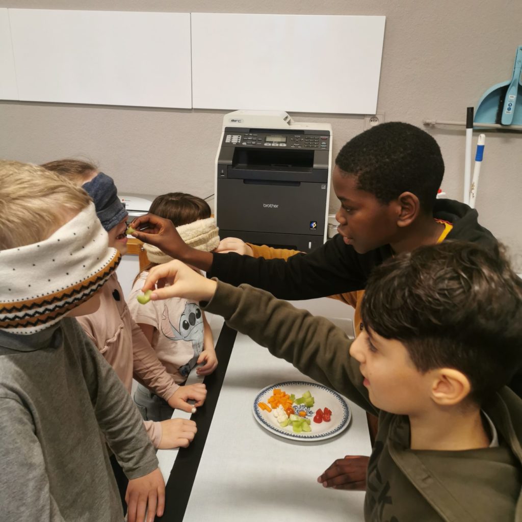 Les élèves de 3e ont joué le jeu de déguster à l'aveugle les légumes de saison. La carotte a directement été reconnue mais nous leur avons demandés de décrire ce qu'ils goutaient. La réponse fut : "C'est sucré comme une carotte :)" Le panais et le chou-fleur ont eu moins de succès mais nous avons eu droit à " Ça goûte la terre".