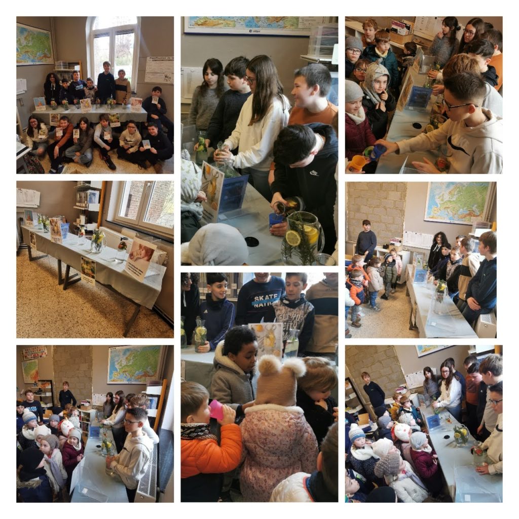Les voicis : “ Boire de l'eau du robinet, c'est préserver notre planète", "L'eau du robinet, la potion magique pour être en forme toute la journée."/ "L'eau du robinet, saine sûre et abordable pour tous. "/" Boire de l'eau du robinet, c'est faire du bien à son corps et à la planète."/"Boire de l'eau du robinet, c'est économique et rigolo." Ensuite, nous avons préparé des potions magiques à l'aide de fruits bio et aussi des herbes aromatiques du jardin. Les enfants de maternelle sont venus les déguster. Ils sont répartis désaltérés et avec le sourire. Nous leur avons également donné nos petites affiches pour qu'ils puissent les mettre dans leur classe et boire de l'eau du robinet :)