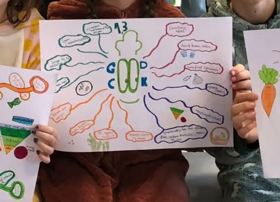 Maak een mindmap van wat jullie leerden tijdens de queeste. Deze gaat jullie helpen hier thuis en aan anderen over te vertellen. Zorg dat de verschillende queestes aan bod komen: eet meer plantaardig, vermijd overbodige verpakking, voorkom voedselverspilling, … Je kan ook per groepje een mindmap maken per queeste. We denken vaak in beelden, dus maak ook tekeningen in je mindmap.