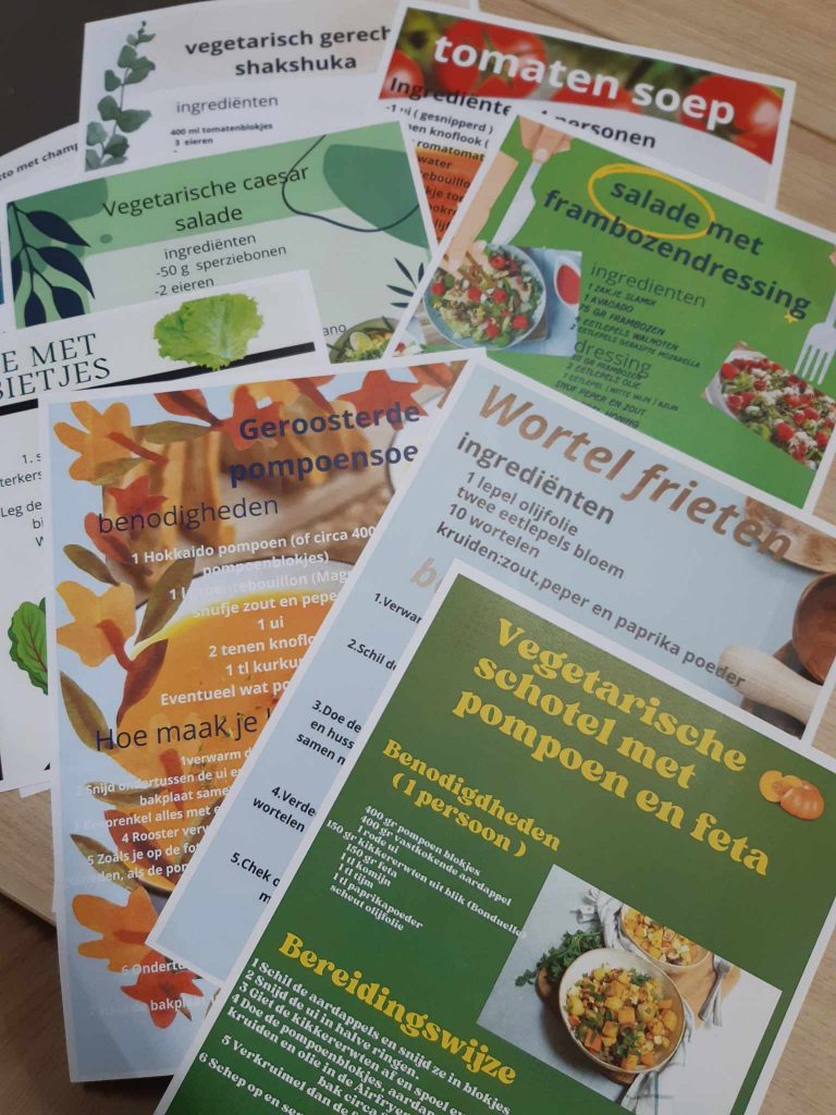Let op: We maken een 100% plantaardig klaskookboekje. We kiezen dus voor volledig plantaardige recepten zonder vlees, vis, eieren en kaas en met juist meer groenten, peulvruchten, bonen, noten en zaden. Synoniem voor ‘plantaardig’ is vegan of veganistisch.